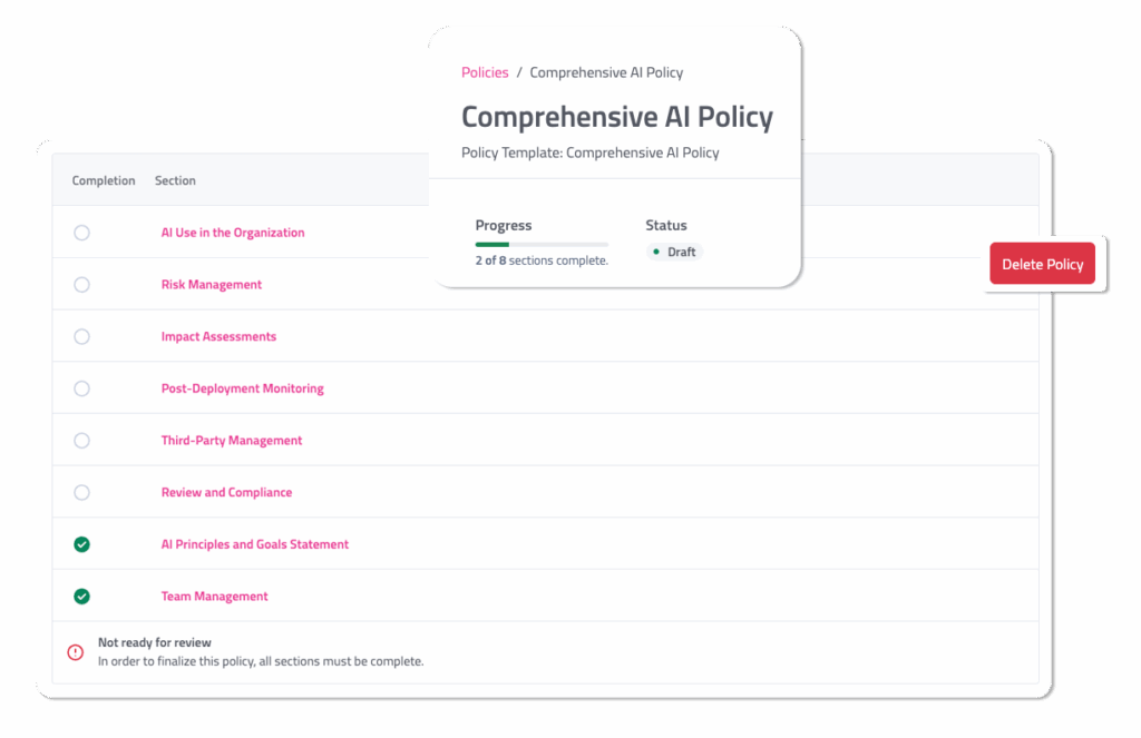 Ensure your AI policies, use cases, models, and vendors comply with relevant regulations and standards. Use compliance checklists and frameworks to benchmark your organizational readiness.