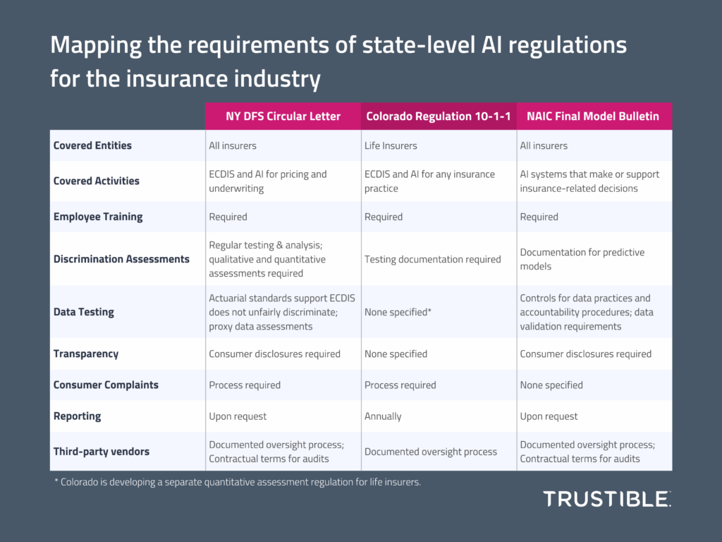 This regulatory patchwork creates challenges  for insurers, who must ensure that their AI systems are compliant across state lines while avoiding risks such as bias and discrimination. At Trustible, we’ve developed a solution to simplify this legal complexity.
