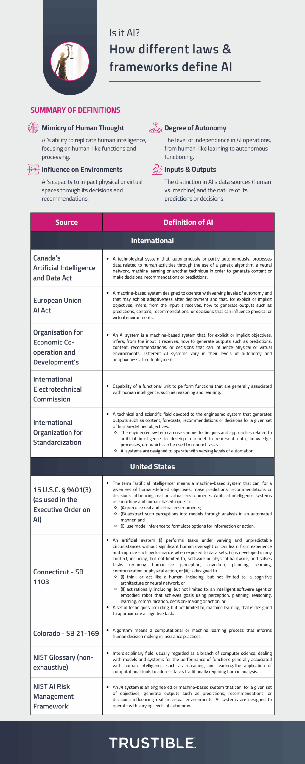 AI definitions across legislation and standard-setting bodies tend to raise four key themes: (i) the ability for the system to mimic human thought; (ii) the degree to which the system will influence environments; (iii) the sources of the system’s inputs and nature of its outputs; and (iv) the system’s degree of autonomy. These themes underscore how the spectrum of existing tools (i.e., algorithms, models, rules-based systems, and statistical programs) generally fall into the bucket of AI, but may fall short of being AI from a compliance perspective. In order to see the practical scope of various AI definitions, each theme will consider how the language would apply to the following use cases: