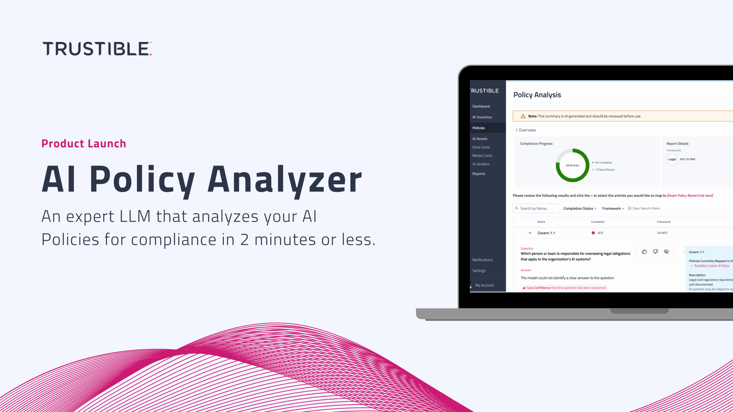 For enterprise AI leaders and governance experts, developing Policies to guide the appropriate use and risk mitigation of AI can be a daunting task. Moreover, understanding whether that policy is compliant with AI regulations and standards can be costly, time-consuming, and overwhelming. Trustible’s AI Policy Analyzer is an expert AI system designed to simplify this process, providing an automated analysis of your existing AI policies in just minutes.