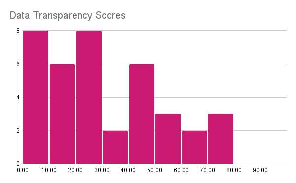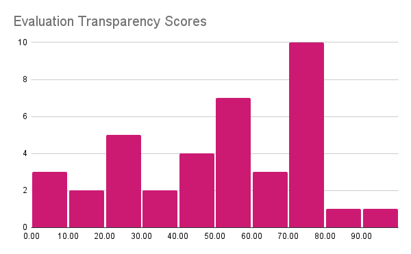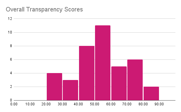 The four charts below show the distribution of overall scores and the main category scores. The overall scores are normally distributed near 50% showing that developers are about half open, providing many details about some things and omitting other topics. The Data Distribution is more concerning, many developers provide little to no information about the data; even the best ones do not disclose every detail. On Evaluation, the scores are higher because most developers will report benchmark performance (however few use public/reproducible tools) and mention the presence or lack of adversarial testing. Finally, the Model and Training category that tracks information about Model Design and Training does not show a consistent trend.