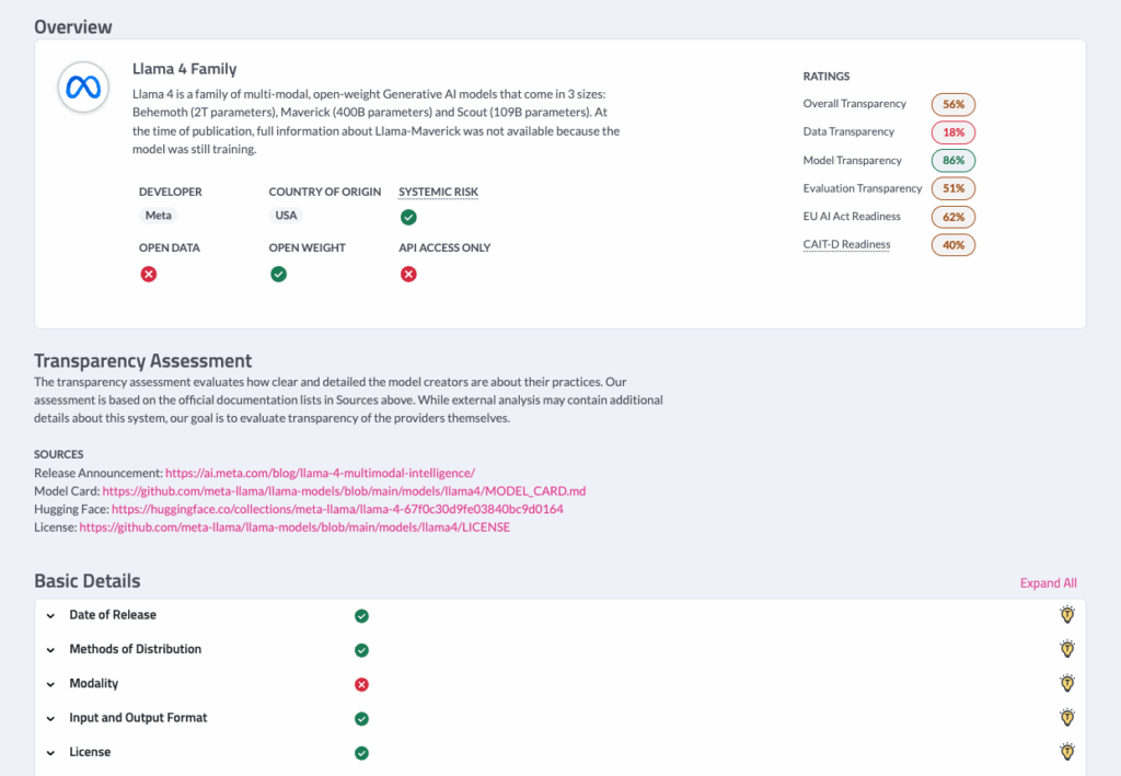Example Model Transparency Rating for the recently released Llama 4 Family of Models from Meta